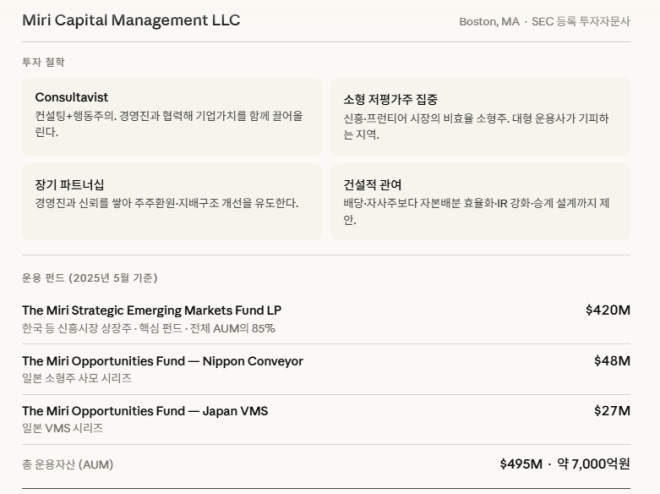 또 회사는 팀이 미국과 일본 오피스 기반으로 운영된다고 밝히고 있으며 일본에서는 별도 법인을 통해 리서치를 수행한다고 설명한다. 이 점은 미리캐피탈이 한국을 포함한 아시아 시장을 일회성 테마로 접근하는 것이 아니라 일정한 지역적 기반과 조사 체계를 갖춘 채 바라보고 있음을 시사한다. 벤 그리피스 대표를 포함한 이 회사의 리더십은 결국 한국 시장을 단순히 ‘멀고 낯선 시장’이 아니라 장기적 가치투자와 관여[Engagement]형 전략이 통할 수 있는 비효율적인 시장으로 보고 있는 것이다.